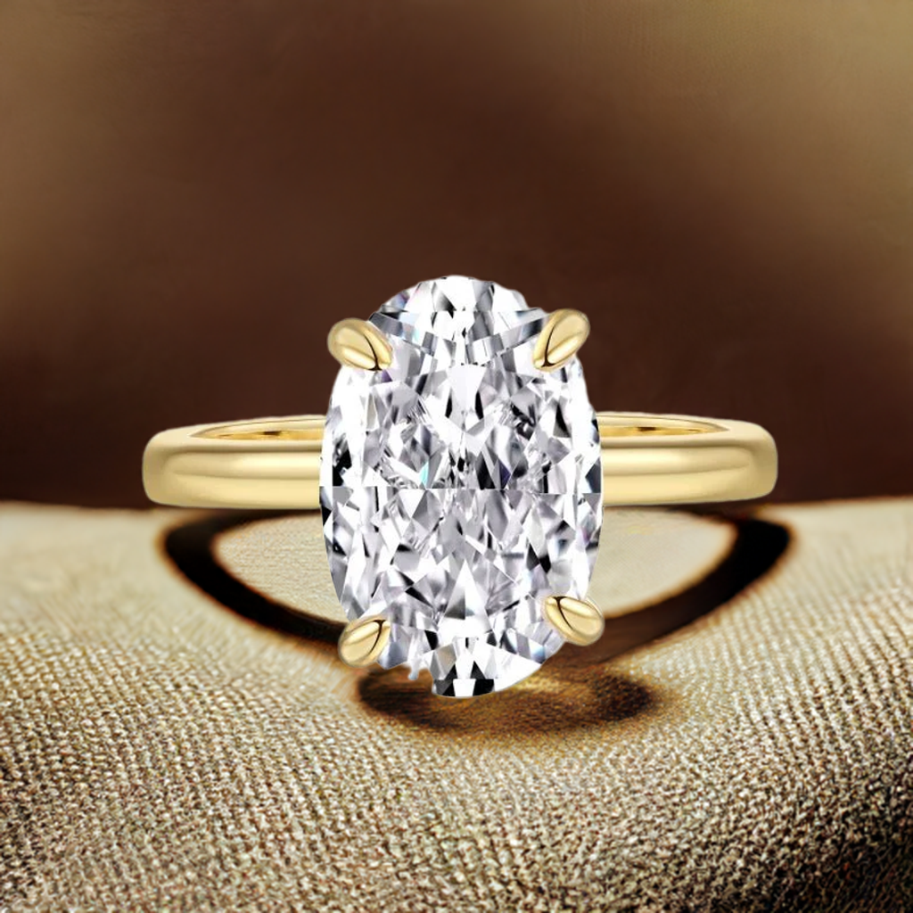 Enhance your style with our Eva oval cut ring in 18k gold plating. The stunning oval cut solitaire radiates luxury and elegance. With a radiant cut and 3.5 carat simulated main stone, this ring will elevate any look. Make a bold statement with this stunning piece.