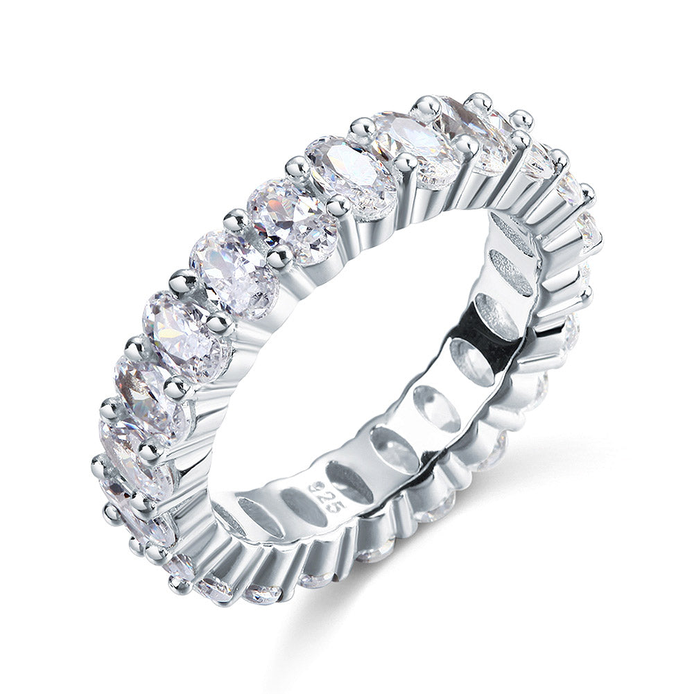 Introducing our ‘Halo Ring,’ a radiant embodiment of eternal allure. This exquisite piece features an Oval Cut Eternity design, crafted in Solid Sterling 925 Silver, adorned with created diamonds that gracefully encircle the entire band. The Oval Cut, celebrated for its timeless elegance, takes centre stage, surrounded by a brilliant halo of shimmering diamonds.
