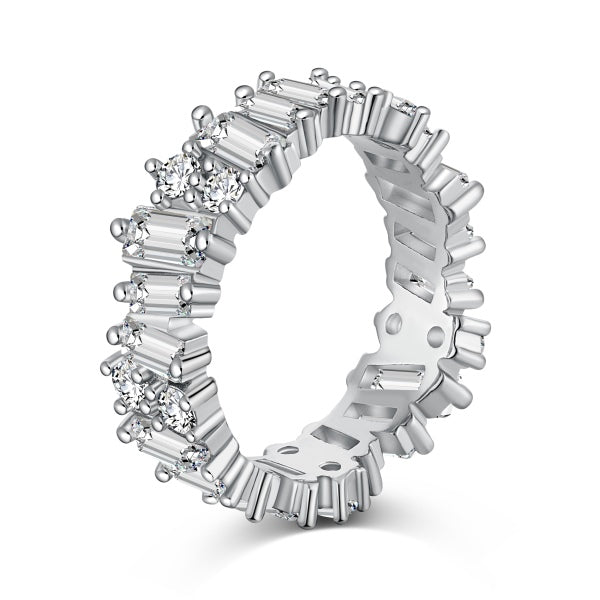 Our Milan band is a stunning eternity band with a mix of rectangle and circle simulated diamonds for a unique and beautiful look. This band can be worn on its own or stacked with our solitaire rings.