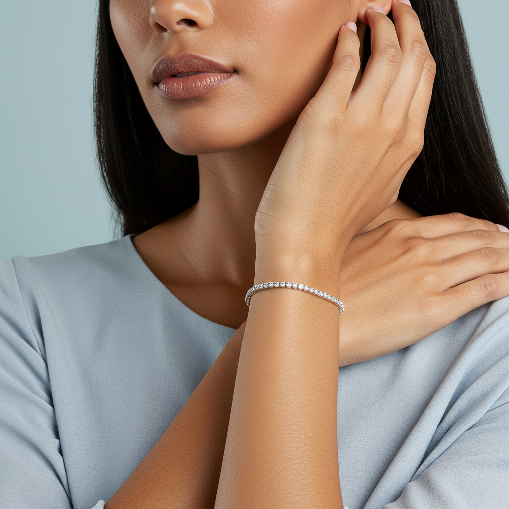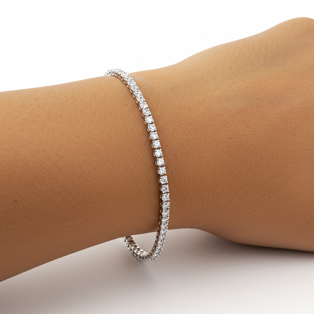This stunning and dainty 2mm silver tennis chain bracelet adds class and sophistication to any outfit. It has an adjustable length and sparkles in the light.